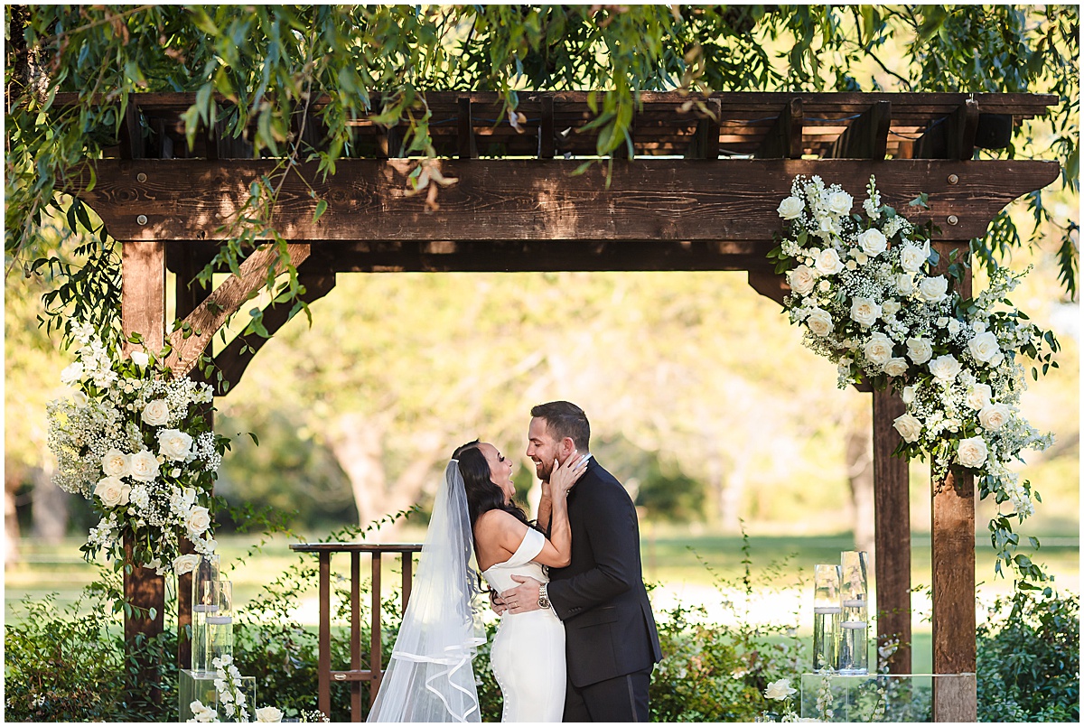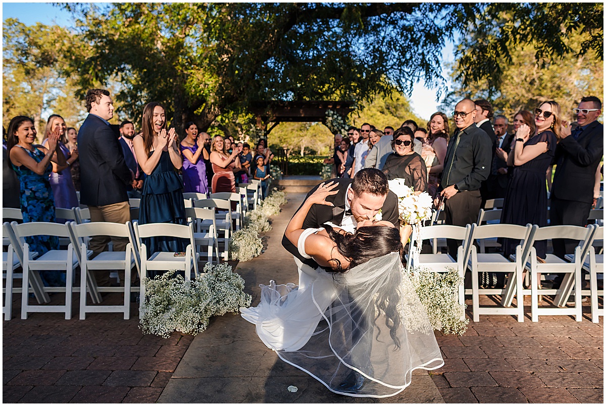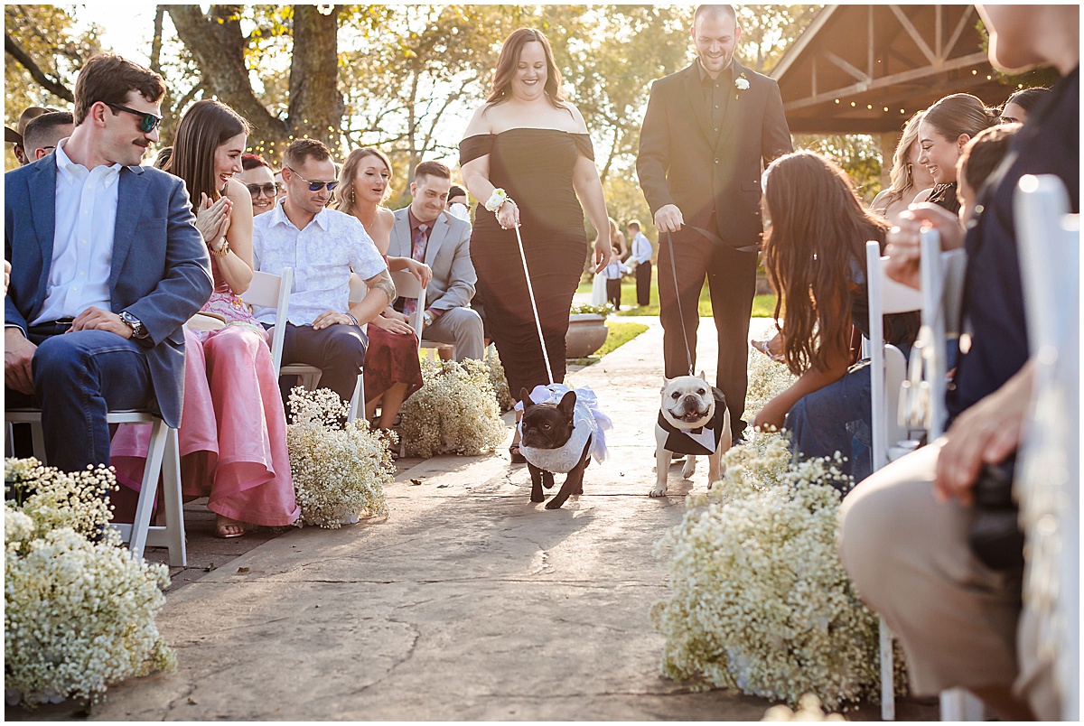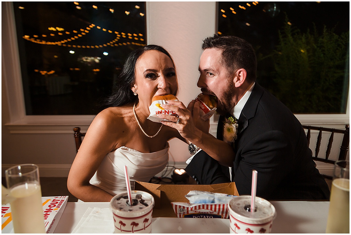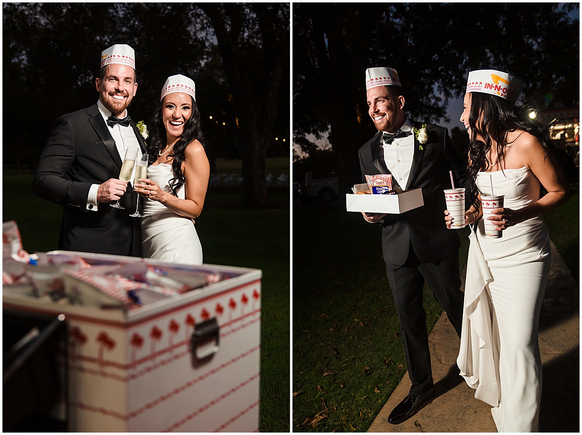 The crowd cheered as he walked down the aisle with multiple high fives. But when she turned the corner to walk to her man, it was sighs and cries. So, so sweet. Everyone, young and old, knew they were perfect for one another. The ceremony was nestled under a giant oak tree with their two pups watching. Picture-perfect moment. Sealed with a kiss and off to celebrate! This was the first time we have seen a Five Guys Burger Truck at a wedding…hats and all!! So unique and fun for their guests. (And yummy)